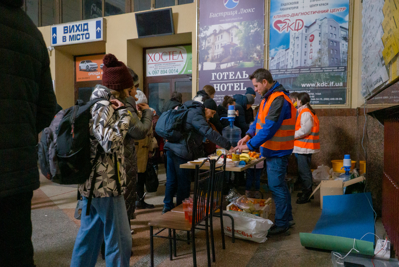 - Arbetar som volontärer på järnvägsstationen i Ivano-Frankivsk där de tar emot internflyktingar som kommer med tåg från de centrala och östra delarna. Delar ut mat, medicin och förnödenheter och hjälper till med information. Delar ut te, kaffe, smörgåsar, barnmat, godis, borstj och andra varma rätter från en lokal restaurang. ”Det kommer folk som inte har ätit på tre dagar”, berättar volontärer från Stan. Läs mer här.