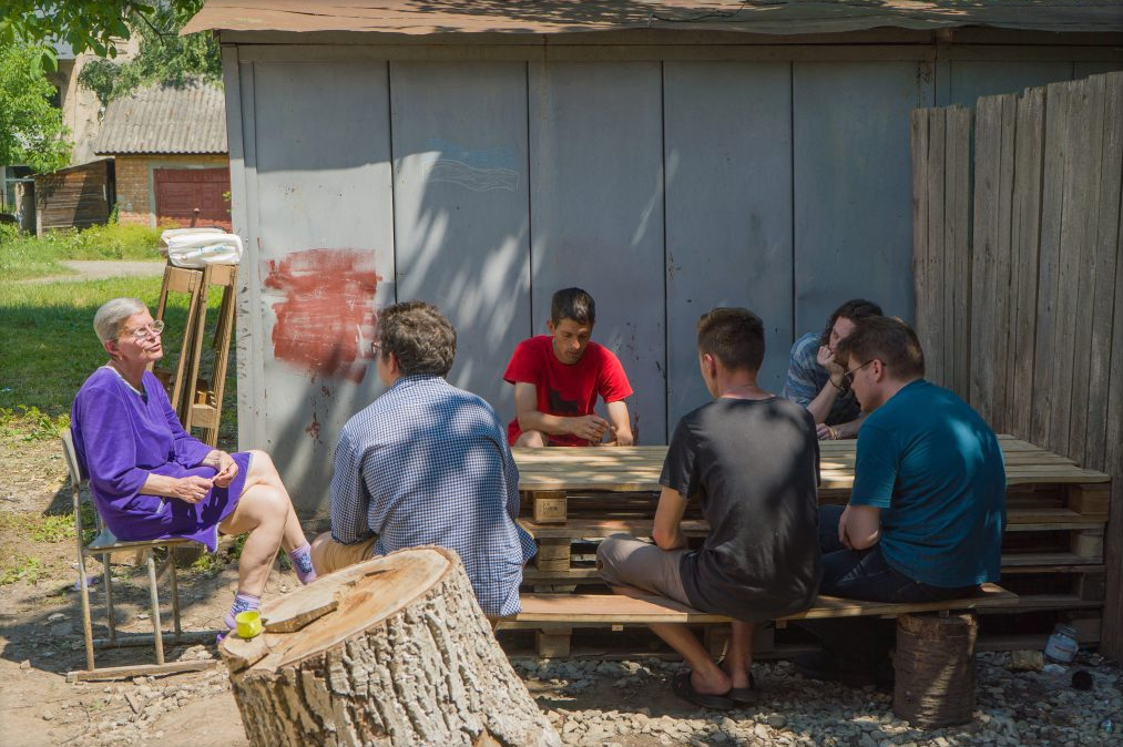 Vi sitter vid det provisoriska bordet på bakgården till ett av härbärgena i Kolomyia. Människorna berättar sina historier. Varje berättelse är speciell, men fortsättningen är gemensam: de kom till Kolomyia där de tilldelades plats i skolan eller på dagis. Senare flyttade de hit – till ett hus i Saint Ignacy Loyolas romersk-katolska kyrkas lokaler. I gamla tider var det ett kloster, under sovjettiden var det ett lager. Senare blev det en klinik för sexuellt överförbara sjukdomar. Sedan stod byggnaden tom en tid och 2022 blev det ett härbärge för de tvångsfördrivna.